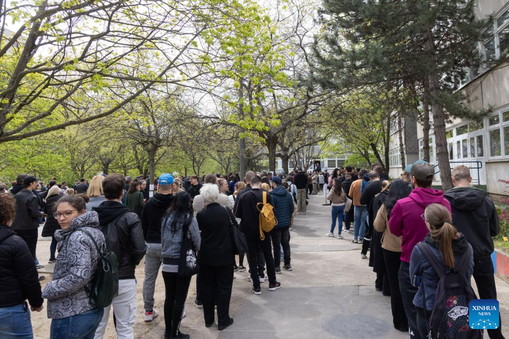 People queue outside a polling station to cast their ballots in Budapest, Hungary, April 12, 2026. Hungary's parliamentary elections kicked off at 6 a.m. local time (0400 GMT) on Sunday, with about 8.1 million eligible voters. (Photo by Attila Volgyi/Xinhua)