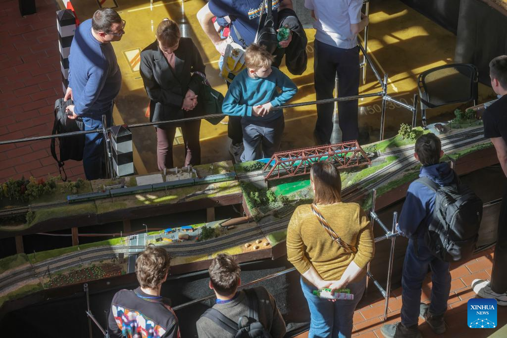 People view exhibits during an exhibition of train and railway dioramas in St. Petersburg, Russia, on April 11, 2026. The exhibition kicked off here on Saturday, showcasing over 240 train and railway dioramas from Russia and other countries. The event runs until April 19. (Photo by Irina Motina/Xinhua)