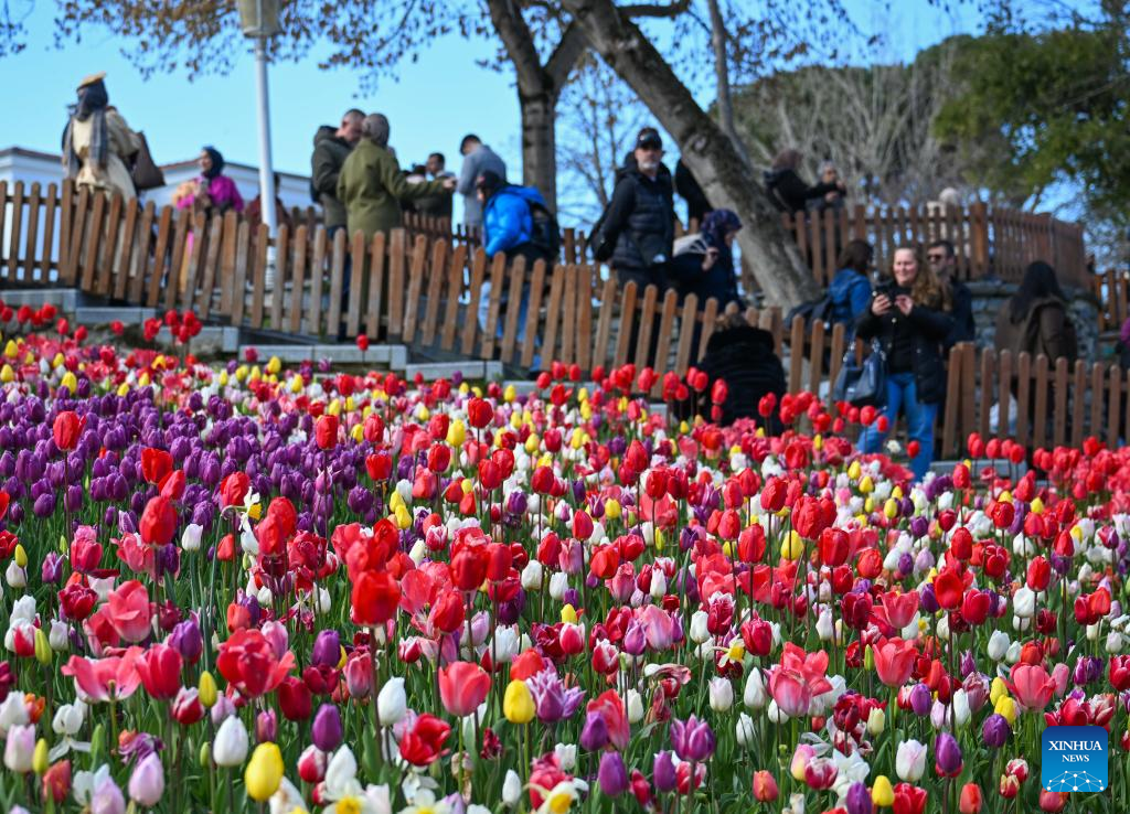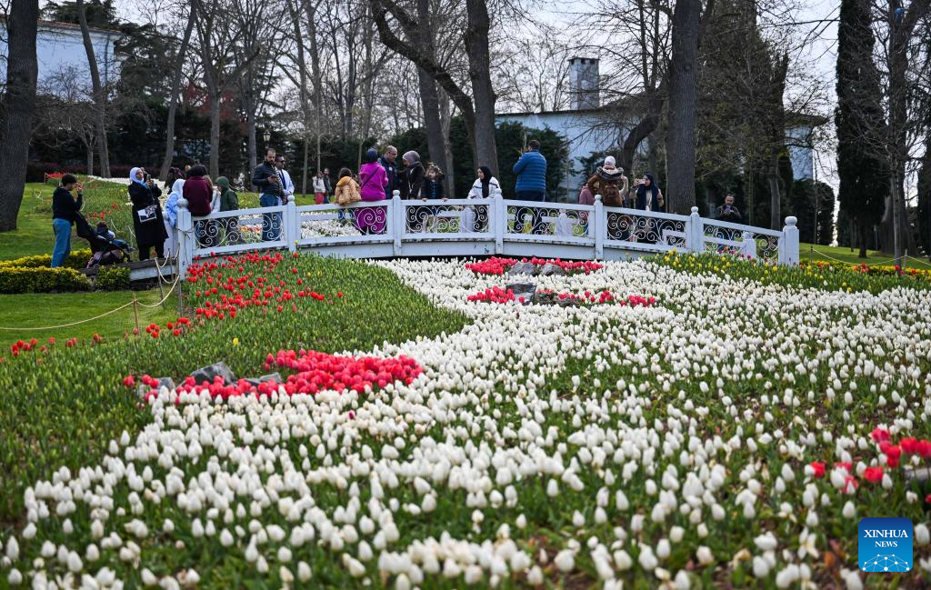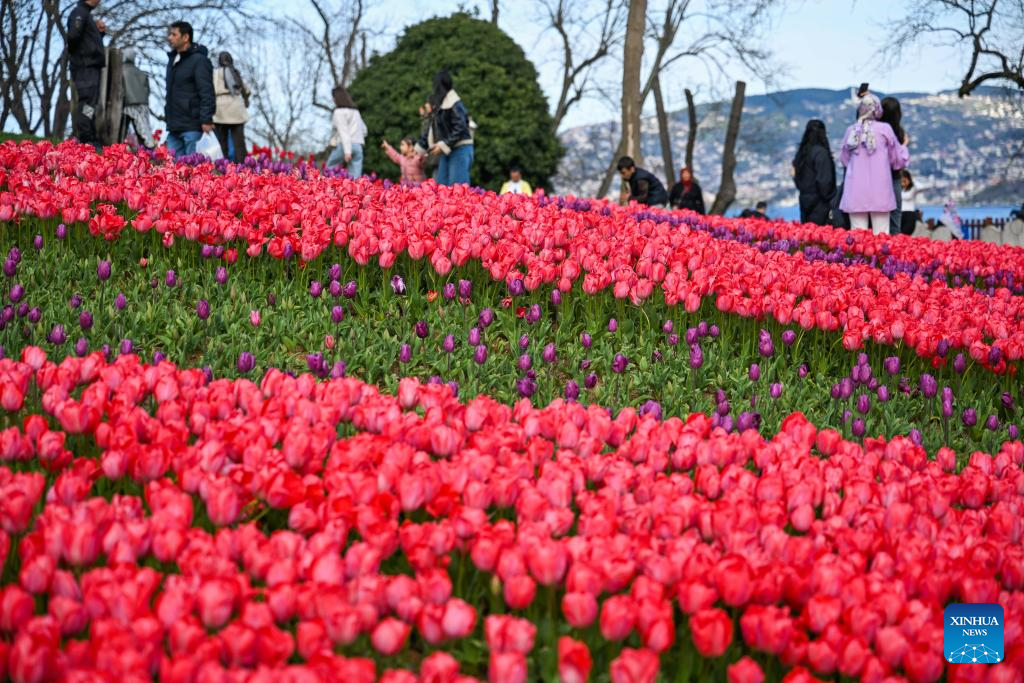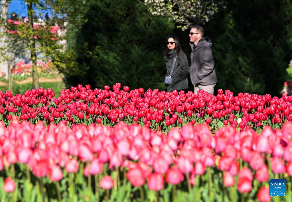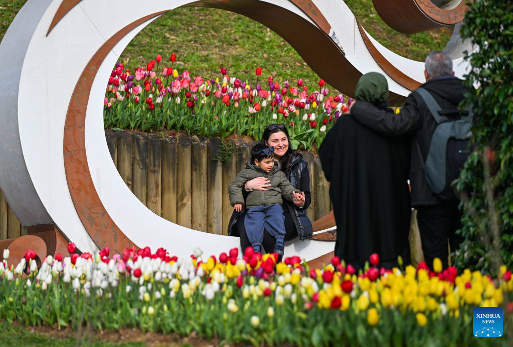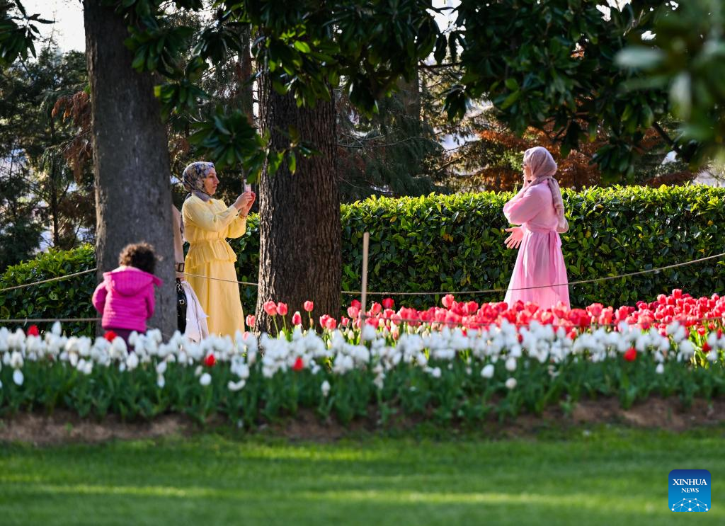 Tourists enjoy blooming tulips at Emirgan Park in Istanbul, Türkiye, on April 11, 2026. The annual Tulip Festival is held here in April. (Xinhua/Liu Lei)
