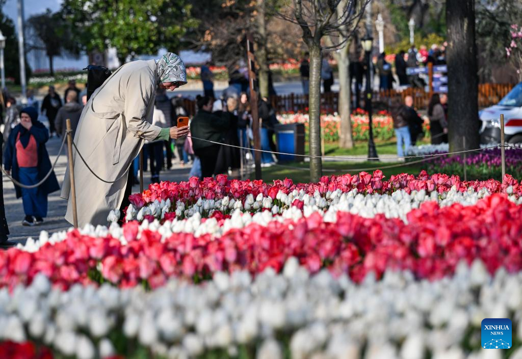 A tourist takes photos of tulips at Emirgan Park in Istanbul, Türkiye, on April 11, 2026. The annual Tulip Festival is held here in April. (Xinhua/Liu Lei)