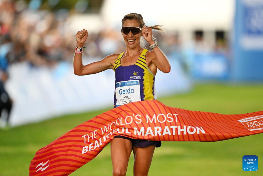 South Africa's Gerda Steyn crosses the finish line to win the women's ultra-marathon title during the 2026 Two Oceans Marathon in Cape Town, South Africa, on April 11, 2026. (Photo by Xabiso Mkhabela/Xinhua)