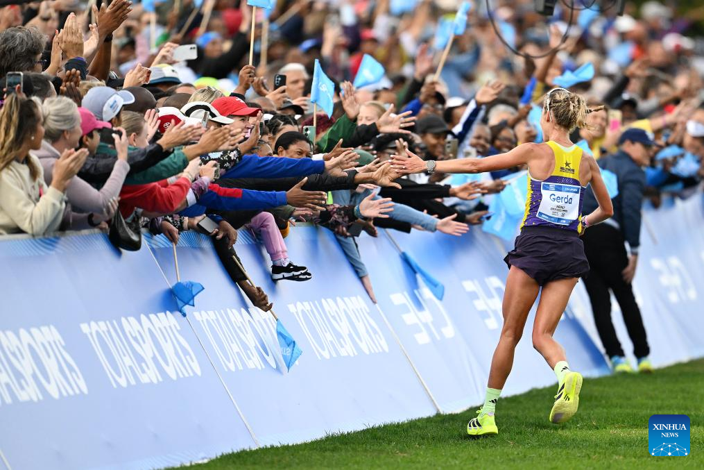 South Africa's Gerda Steyn celebrates with spectators after winning the women's ultra-marathon title during the 2026 Two Oceans Marathon in Cape Town, South Africa, on April 11, 2026. (Photo by Xabiso Mkhabela/Xinhua)