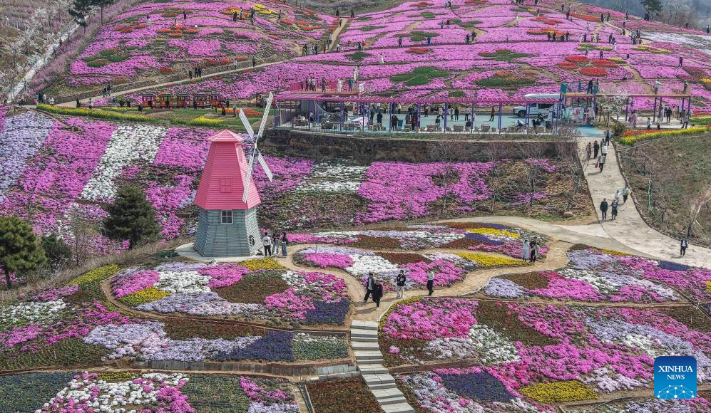 An aerial drone photo taken on April 12, 2026 shows people admiring flowers at a scenic spot in Qianxi County, Tangshan City, north China's Hebei Province. (Photo by Liu Mancang/Xinhua)