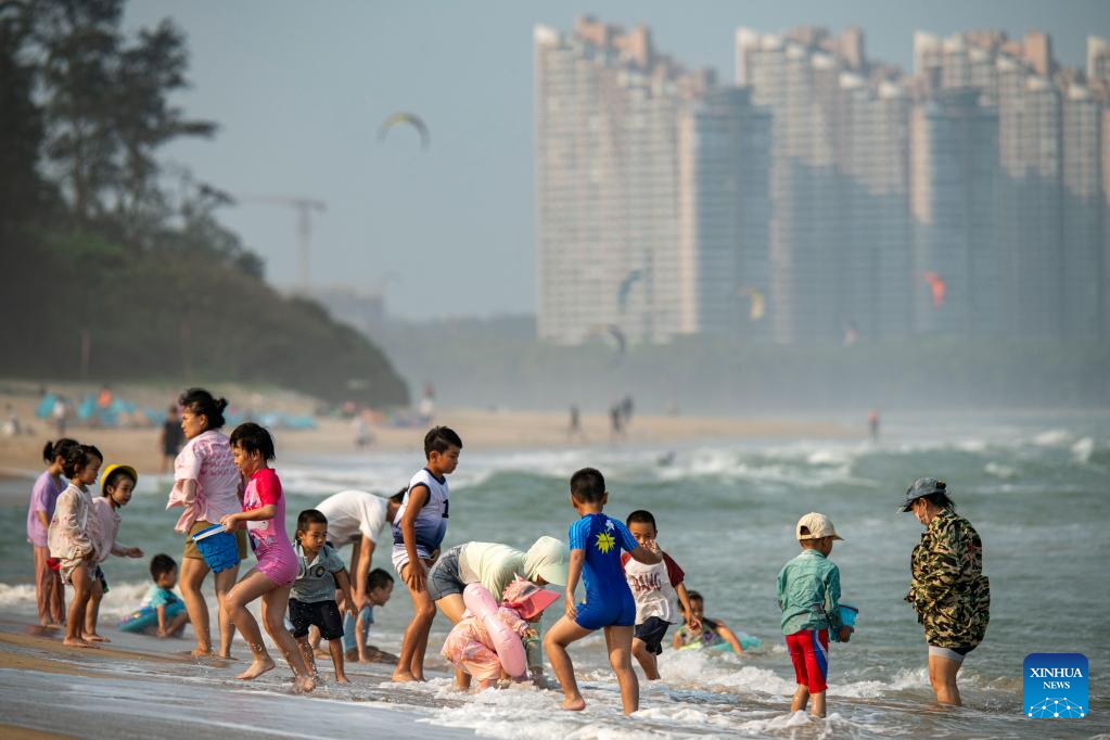 People have fun on the seashore in Qionghai City, south China's Hainan Province, April 12, 2026. (Photo by Meng Zhongde/Xinhua)
