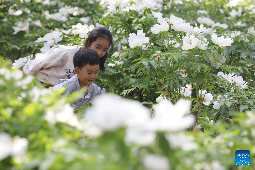Children play amid flowers in Jiaozuo City, central China's Henan Province, April 12, 2026. (Photo by Xu Hongxing/Xinhua)