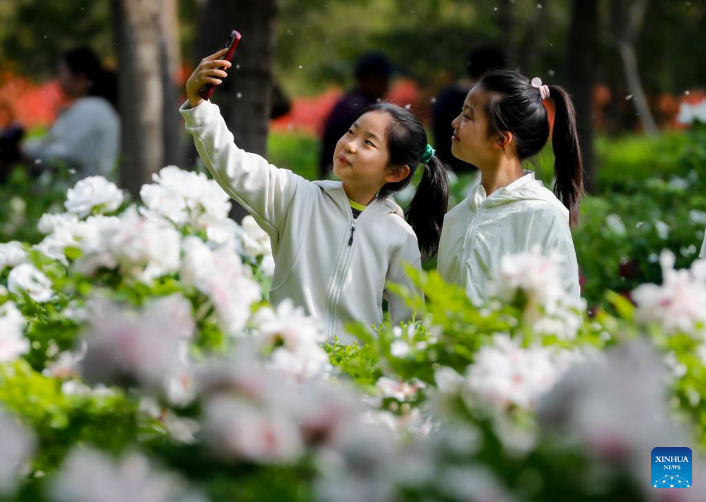 Children pose for selfies at a park in Wuzhi County, central China's Henan Province, April 11, 2026. (Photo by Wang Linfeng/Xinhua)