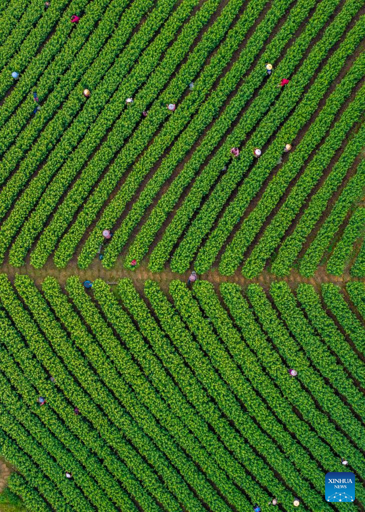 An aerial drone photo taken on April 11, 2026 shows staff working in a tea garden in Yuyao City, east China's Zhejiang Province. Tea farmers and enterprises are busy harvesting and processing spring tea leaves to meet the consumer demand lately. (Photo by Zhang Hui/Xinhua)