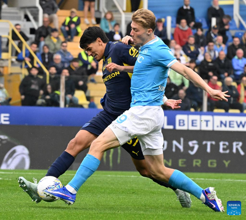 Napoli's Alessandro Buongiorno (L) vies with Parma's Christian Ordonez during a Serie A football match between Parma and Napoli in Parma, Italy, April 12, 2026. (Photo by Alberto Lingria/Xinhua)