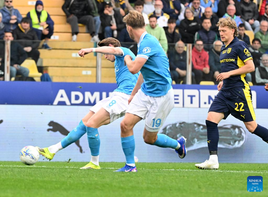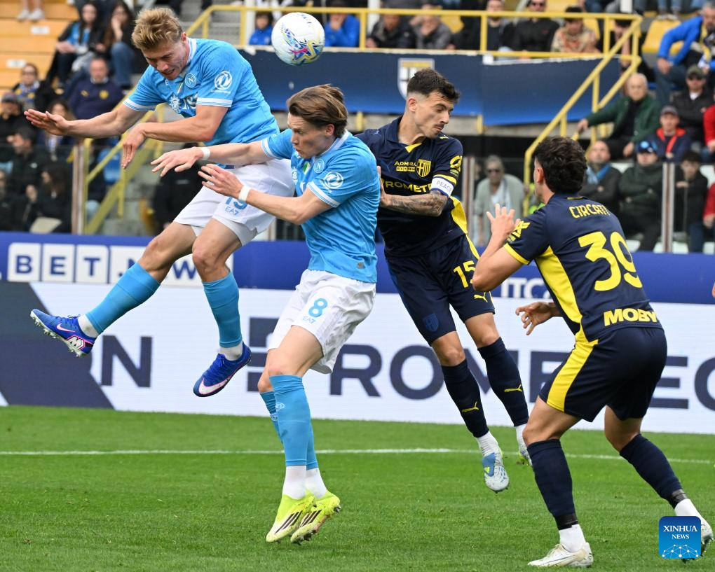 Napoli's Rasmus Hojlund (L) and Scott MCTominay (2nd L) vie with Parma's Enrico Delprato (2nd R) and Alessandro Circati during a Serie A football match between Parma and Napoli in Parma, Italy, April 12, 2026. (Photo by Alberto Lingria/Xinhua)