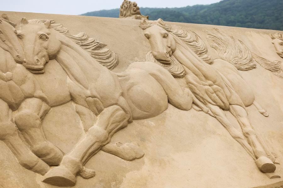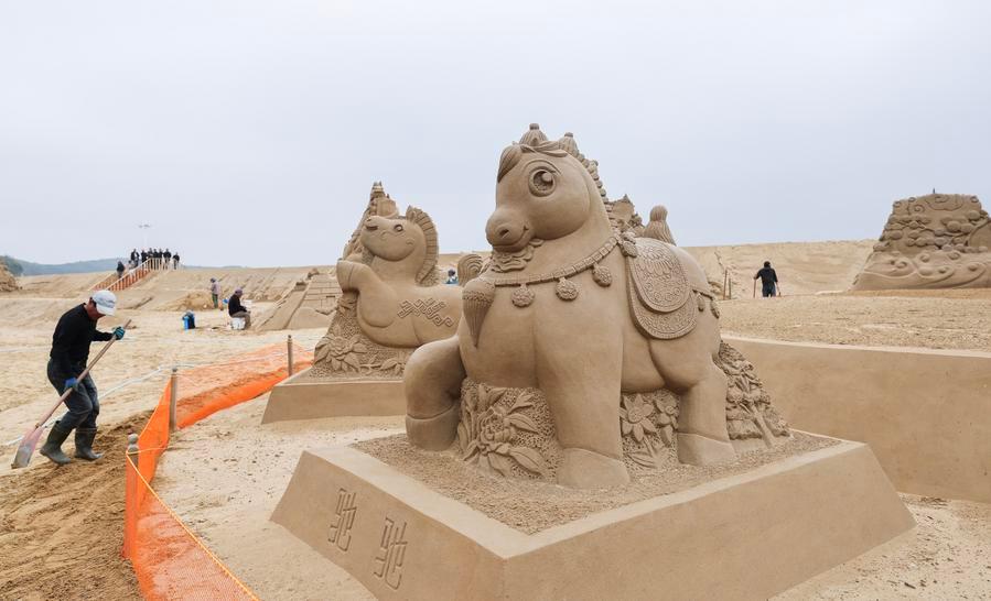 ZHOUSHAN, April 14 (Xinhua) -- Preparation for the 2026 Zhoushan sand sculpture exhibition is progressing smoothly. Covering a total area of 10,000 square meters at the Nansha scenic area in Zhujiajian, the exhibition plans to display more than 50 horse-themed sand sculptures. It is expected to officially open to the public in early May.
