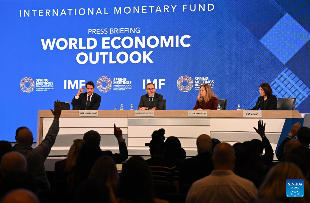 The International Monetary Fund (IMF) chief economist Pierre-Olivier Gourinchas (2nd L) answers questions at a press briefing on the latest World Economic Outlook in Washington, D.C., the United States, April 14, 2026. IMF lowered its global economic growth forecasts for 2026 to 3.1 percent in the World Economic Outlook (WEO) report published on Tuesday, while keeping its projection for 2027 at 3.2 percent. (Xinhua/Li Rui)