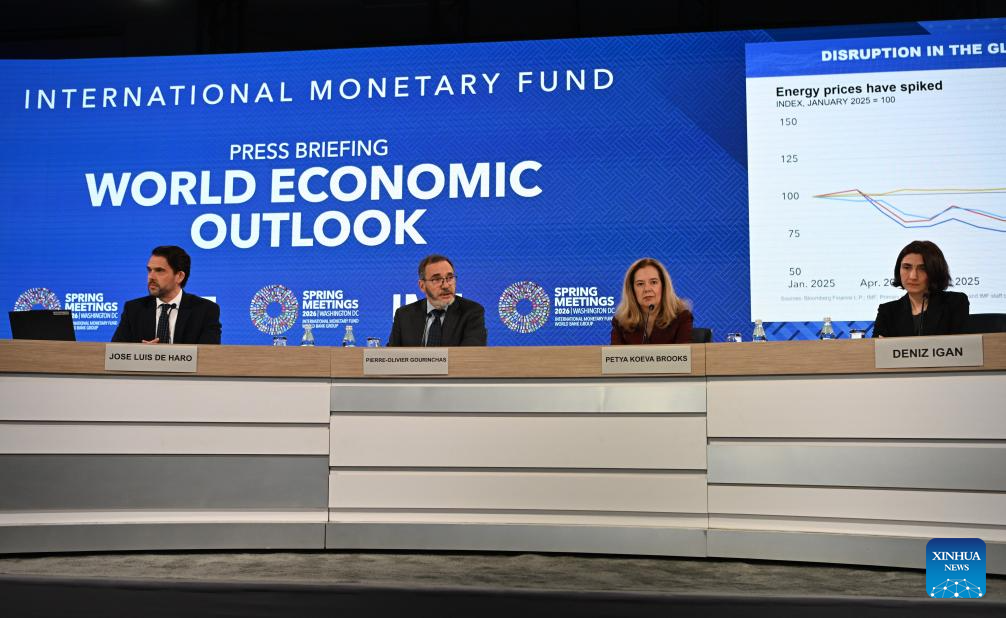 The International Monetary Fund (IMF) chief economist Pierre-Olivier Gourinchas (2nd L) speaks at a press briefing on the latest World Economic Outlook in Washington, D.C., the United States, April 14, 2026. IMF lowered its global economic growth forecasts for 2026 to 3.1 percent in the World Economic Outlook (WEO) report published on Tuesday, while keeping its projection for 2027 at 3.2 percent. (Xinhua/Li Rui)