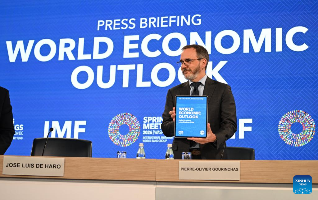 The International Monetary Fund (IMF) chief economist Pierre-Olivier Gourinchas (C) speaks at a press briefing on the latest World Economic Outlook in Washington, D.C., the United States, April 14, 2026. IMF lowered its global economic growth forecasts for 2026 to 3.1 percent in the World Economic Outlook (WEO) report published on Tuesday, while keeping its projection for 2027 at 3.2 percent. (Xinhua/Li Rui)
