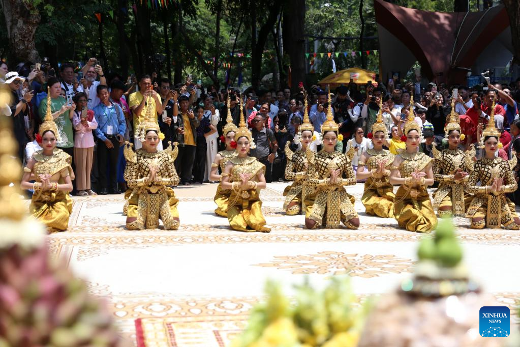 Artists perform during a traditional New Year greeting at the Wat Phnom historical site in Phnom Penh, Cambodia, April 14, 2026. Cambodia on Tuesday started to celebrate its traditional three-day Lunar New Year -- the Year of the Horse. (Photo by Sovannara/Xinhua)