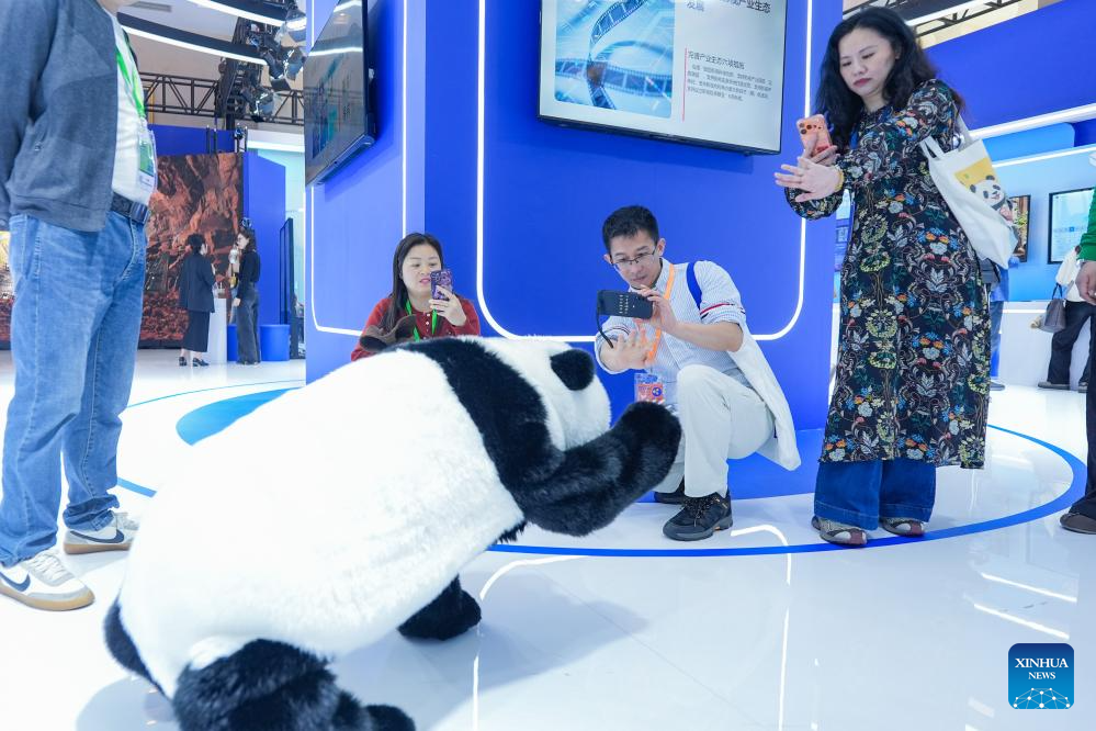 Participants interact with a simulated robotic panda during the 13th China Internet Audio and Video Convention in Chengdu, southwest China's Sichuan Province, April 15, 2026. The convention kicked off here on Wednesday, featuring a series of thematic forums, release events, film screenings and other activities. (Xinhua/Wang Xi)