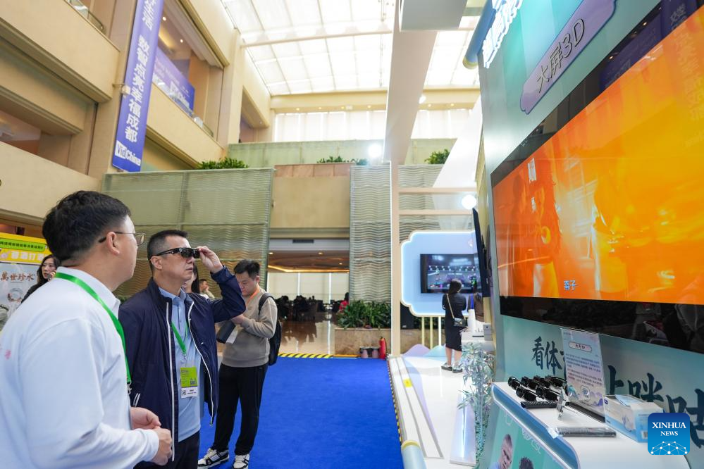 A participant views exhibits during the 13th China Internet Audio and Video Convention in Chengdu, southwest China's Sichuan Province, April 15, 2026. The convention kicked off here on Wednesday, featuring a series of thematic forums, release events, film screenings and other activities. (Xinhua/Wang Xi)