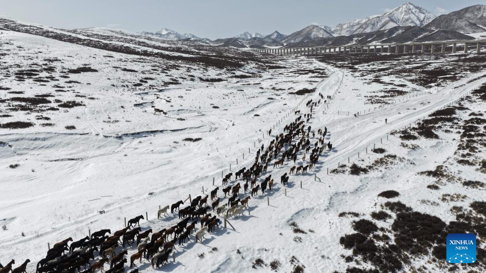 An aerial drone photo taken on April 14, 2026 shows horses of the Shandan Horse Breeding Farm in northwest China's Gansu Province. During plowing season, herdsmen started to guide horses to move from farmlands to natural grasslands. (Photo by Wang Chao/Xinhua)