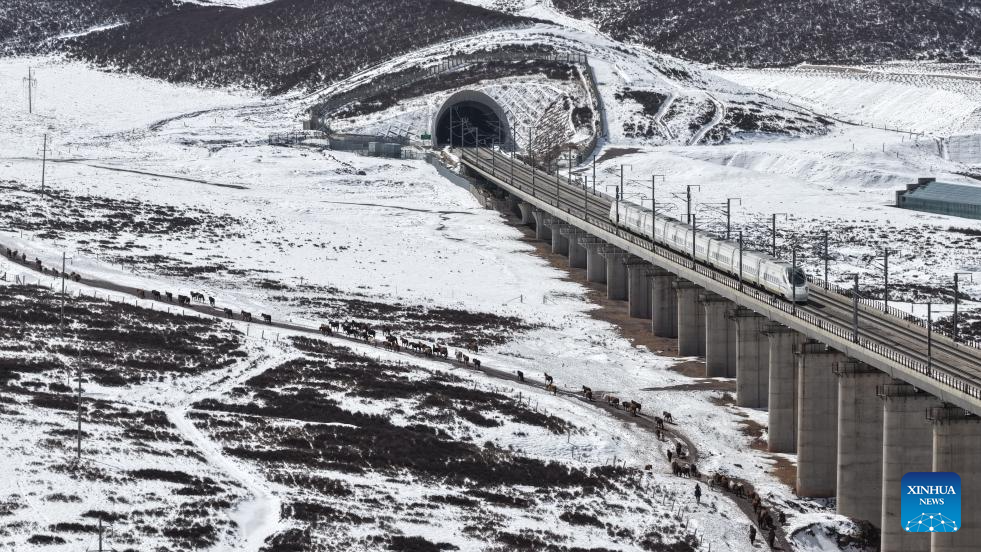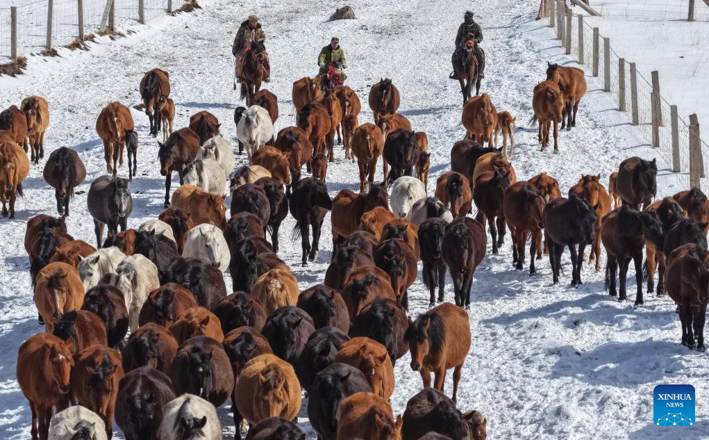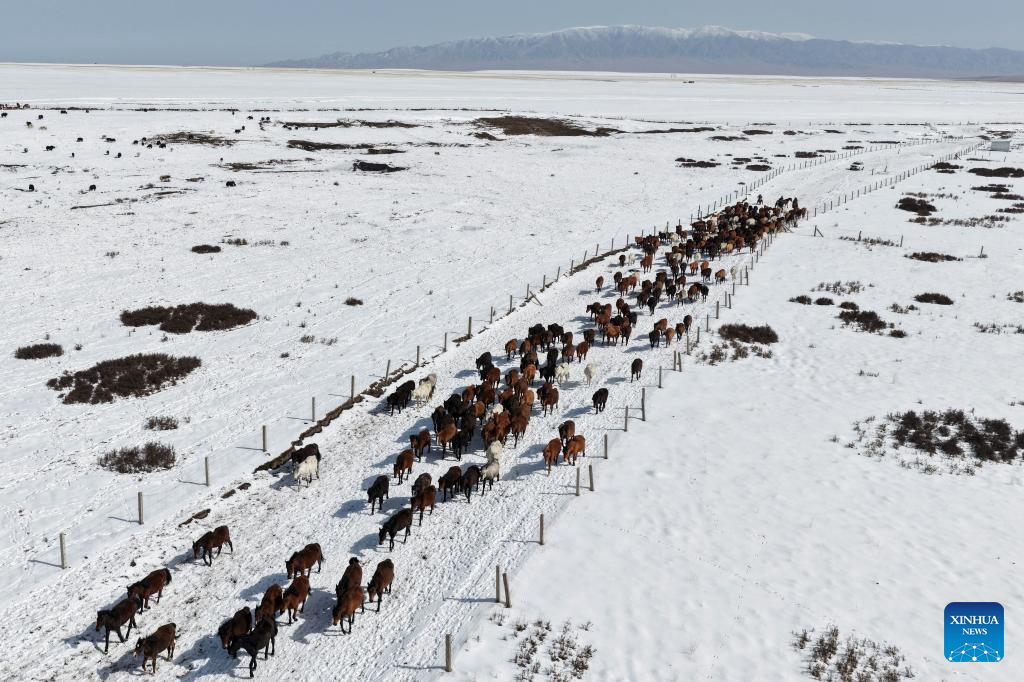 A drone photo taken on April 14, 2026 shows horses of the Shandan Horse Breeding Farm in northwest China's Gansu Province. During plowing season, herdsmen started to guide horse herds from farmlands to natural grasslands. (Photo by Wang Chao/Xinhua)