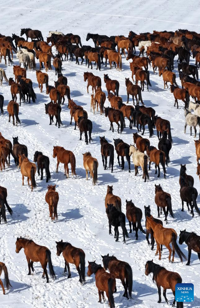 An aerial drone photo taken on April 14, 2026 shows horses of the Shandan Horse Breeding Farm in northwest China's Gansu Province. During plowing season, herdsmen started to guide horse herds from farmlands to natural grasslands. (Photo by Wang Chao/Xinhua)