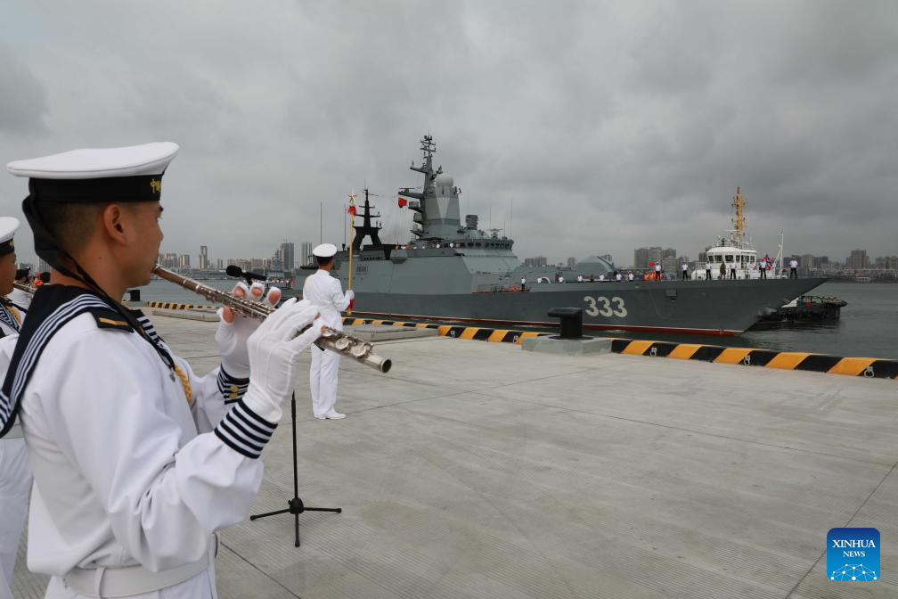 A frigate of a Russian navy fleet arrives at a military port in Zhanjiang, south China's Guangdong Province, April 15, 2026. A Russian navy fleet consisting of two frigates and a medium-sized replenishment ship arrived in south China's Guangdong Province on Wednesday for a five-day friendly visit.