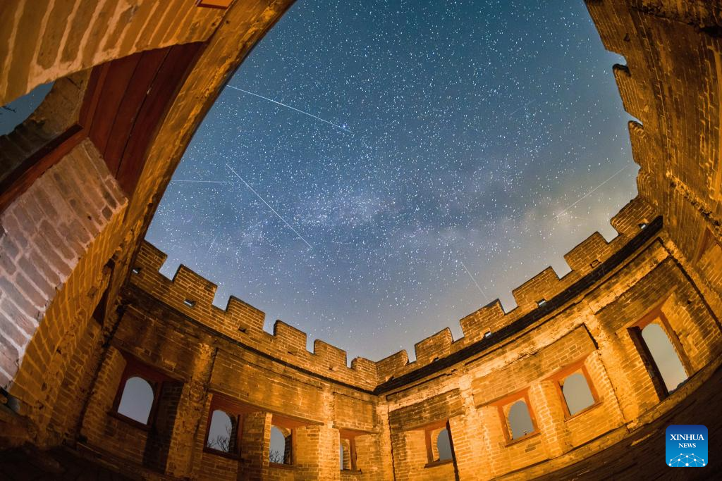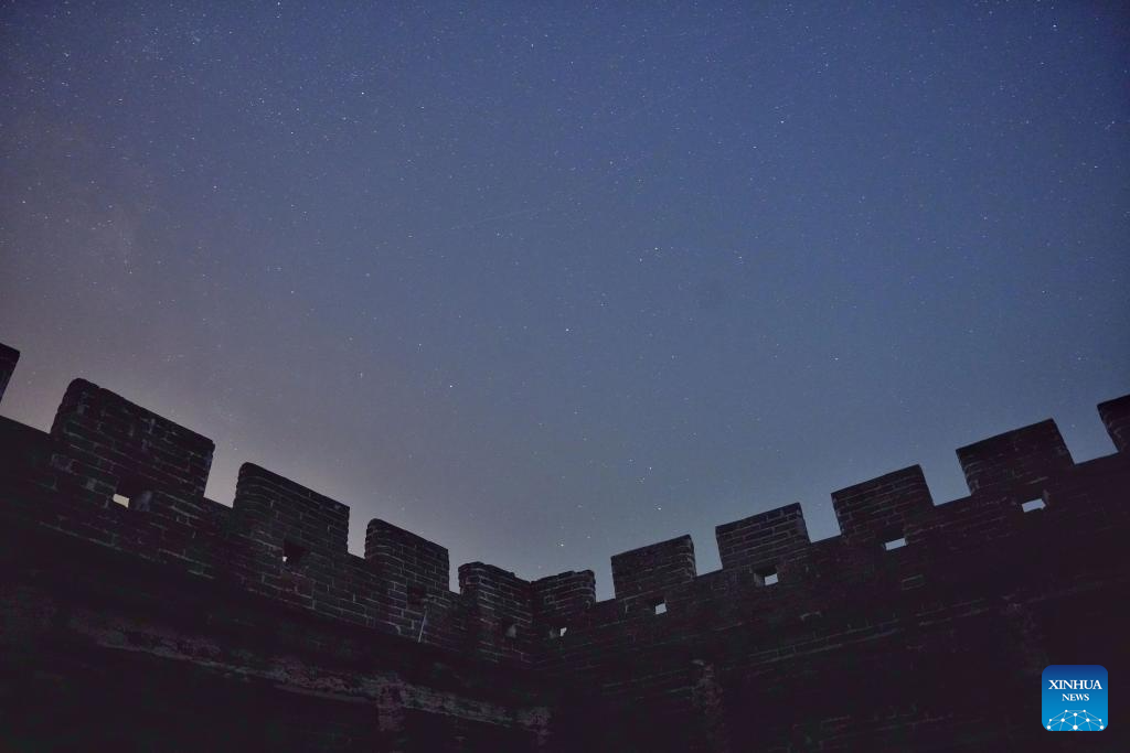 This photo taken on April 15, 2026 shows a view of the starry sky above the Jinshanling section of the Great Wall in Chengde City, north China's Hebei Province. (Photo by Wang Junfeng/Xinhua)