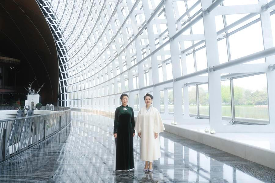 BEIJING, April 15 (Xinhua) -- Peng Liyuan, wife of General Secretary of the Communist Party of China Central Committee and Chinese President Xi Jinping, and Ngo Phuong Ly, wife of General Secretary of the Communist Party of Vietnam Central Committee and Vietnamese President To Lam, visited China's National Center for the Performing Arts (NCPA) in Beijing on Wednesday.