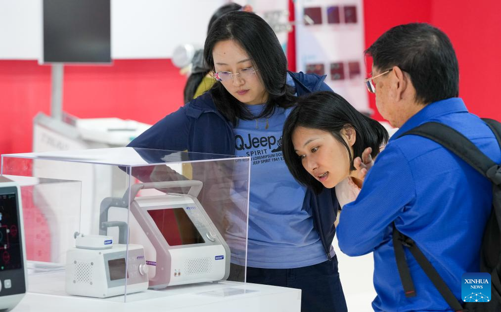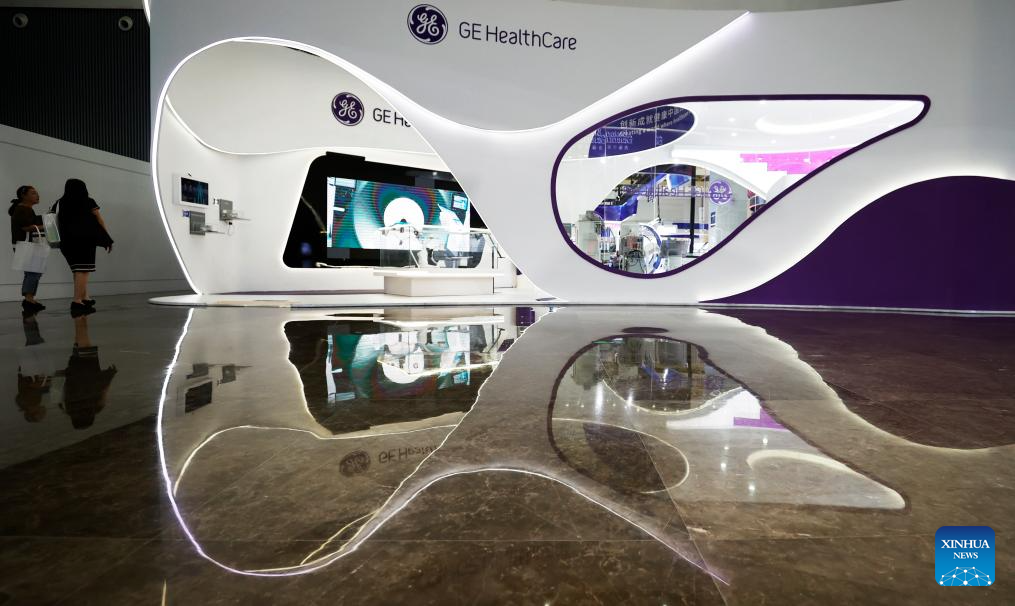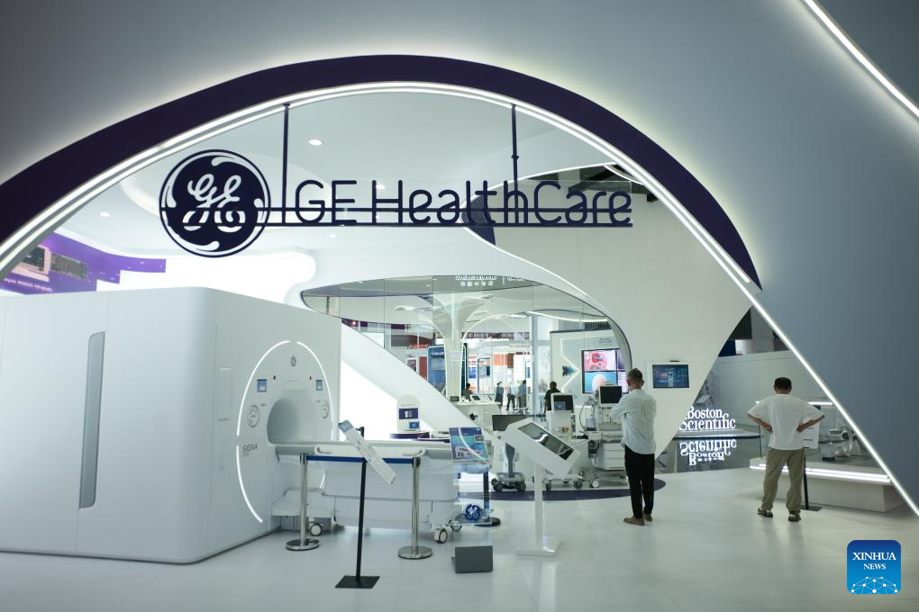 People visit the GE HealthCare booth at the international health and wellness sub-venue of the sixth China International Consumer Products Expo (CICPE) at Boao Lecheng International Medical Tourism Pilot Zone in Qionghai, south China's Hainan Province, April 16, 2026. More than 340 international brands from over 30 countries and regions participate in the exhibition from April 13 to 18, displaying over 1,300 kinds of international innovative pharmaceutical equipment, technologies and special food products. (Xinhua/Gao Jing)