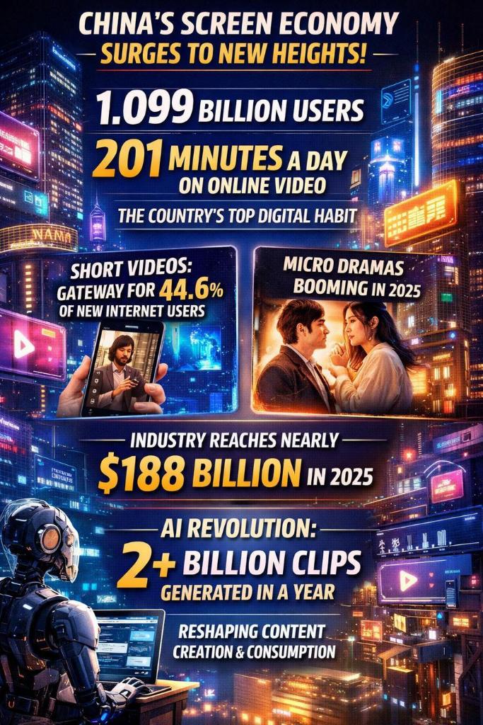 China's online audiovisual sector has surpassed all other internet applications by user base -- 1.099 billion users now spend an average of 201 minutes a day on online video, making it the country's most dominant digital habit. The industry surged to nearly 188 billion U.S. dollars in 2025, powered by short videos -- the gateway for 44.6% of new internet users -- and a boom in micro dramas, which are rapidly overtaking traditional long-form content. Behind the scenes, AI is flooding the ecosystem, generating over 2 billion clips in a single year -- a 14-fold explosion -- reshaping how content is created and consumed. ■