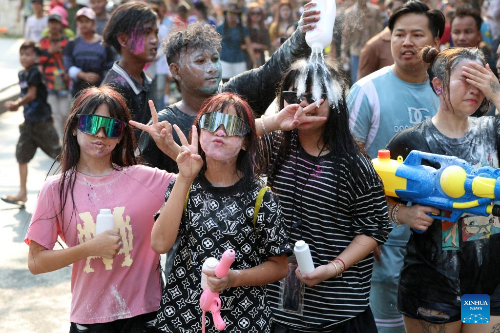 People participate in a water-splashing event on the second day of celebrations of Cambodia's traditional New Year at the Wat Phnom historical site in Phnom Penh, Cambodia, April 15, 2026. (Photo by Sovannara/Xinhua)