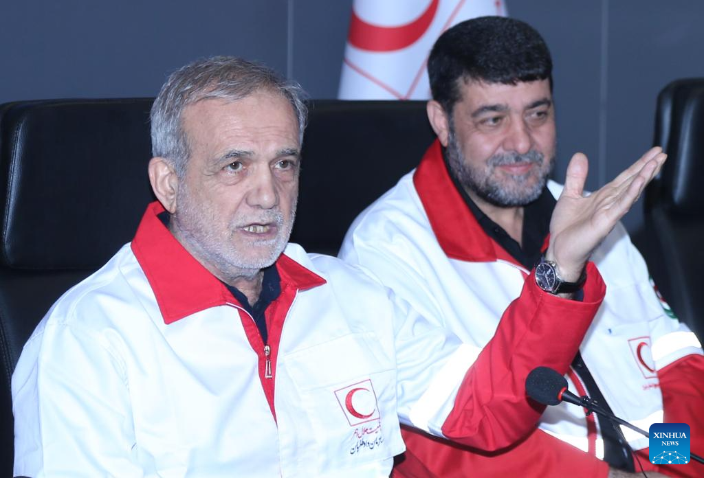 Iranian President Masoud Pezeshkian speaks during his visit to the headquarters of Iran's Red Crescent Society (IRCS) in Tehran, Iran, April 15, 2026. No power can force the Iranian nation to surrender, Iranian President Masoud Pezeshkian said on Wednesday. (Xinhua/Shadati)