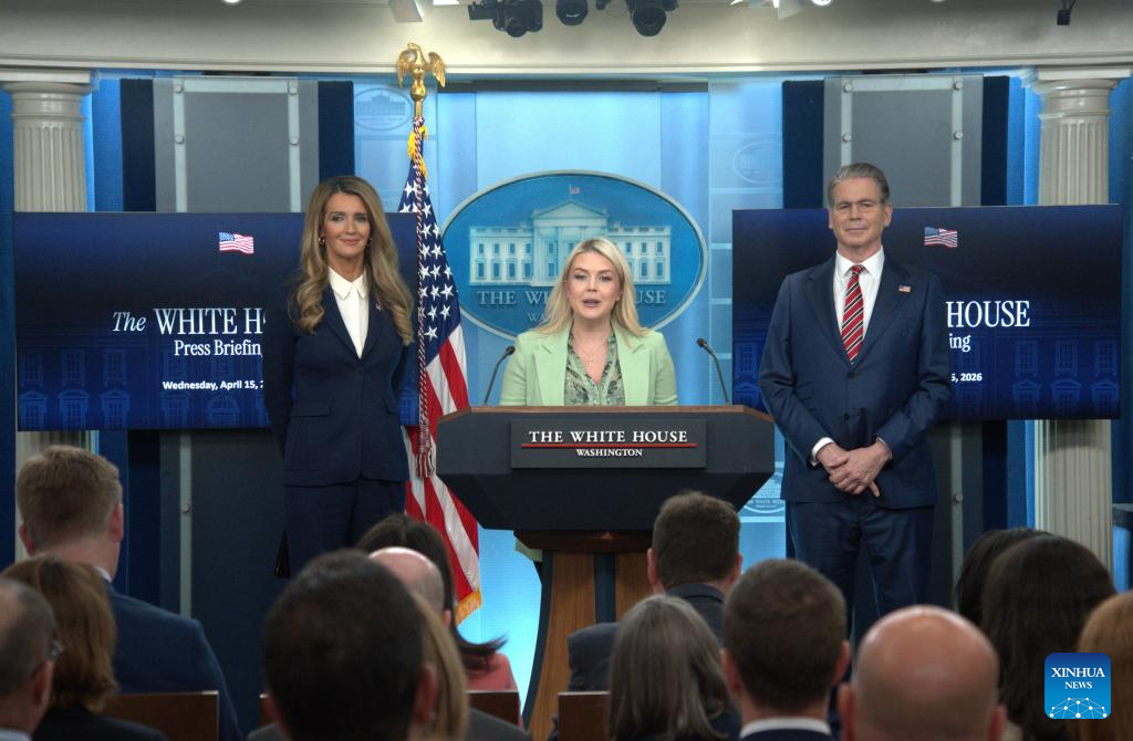 White House Press Secretary Karoline Leavitt speaks during a White House press briefing in Washington, D.C., the United States, April 15, 2026. Leavitt said Wednesday an extension of the current U.S. ceasefire with Iran is "not true at this moment." (Photo by Li Yuanqing/Xinhua)
