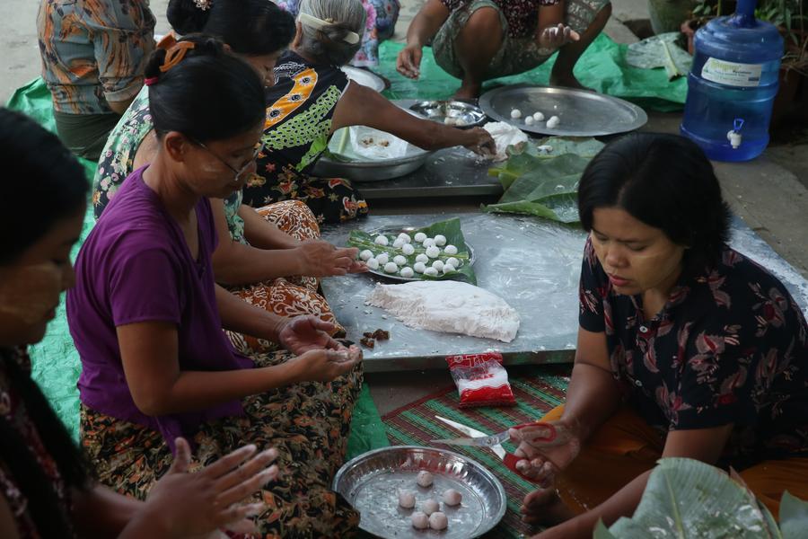 In Yangon's Thaketa township, more than 20 people gathered to prepare sticky rice balls on Wednesday morning. They rolled the small dough balls by hand, sharing laughter as they worked together. Once cooked, the snacks were distributed as Thingyan food to passersby and neighbors, filling the area with a warm and joyful atmosphere.