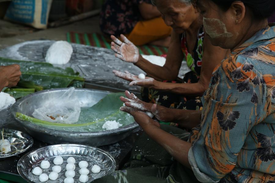 YANGON, April 16 (Xinhua) -- Floating dough balls, locally known as Mont Lone Yay Baw, are traditionally prepared during Myanmar's Thingyan festival as part of long-standing customs. Families make it at home to offer as alms, enjoy together, and share with neighbors.
