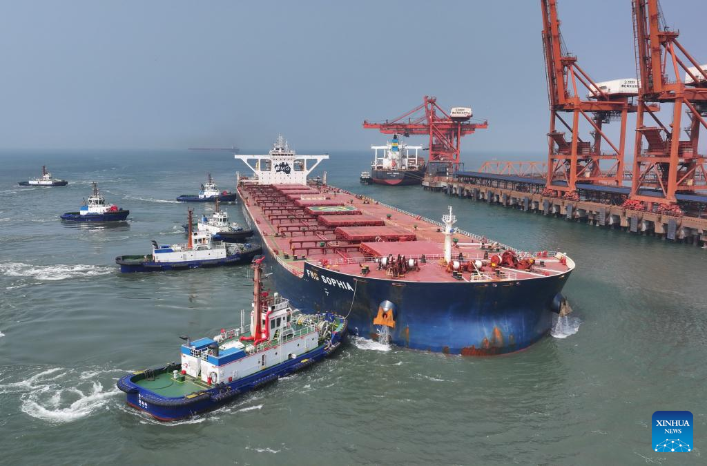 A drone photo taken on April 15, 2026 shows a vessel preparing for departure at the ore terminal of Caofeidian Port Area in Tangshan Port in Tangshan, north China's Hebei Province. From January to March this year, Caofeidian Port Area handled a cargo throughput of 138.03 million tonnes, marking a year-on-year increase of 3.16 percent. (Xinhua/Yang Shiyao)