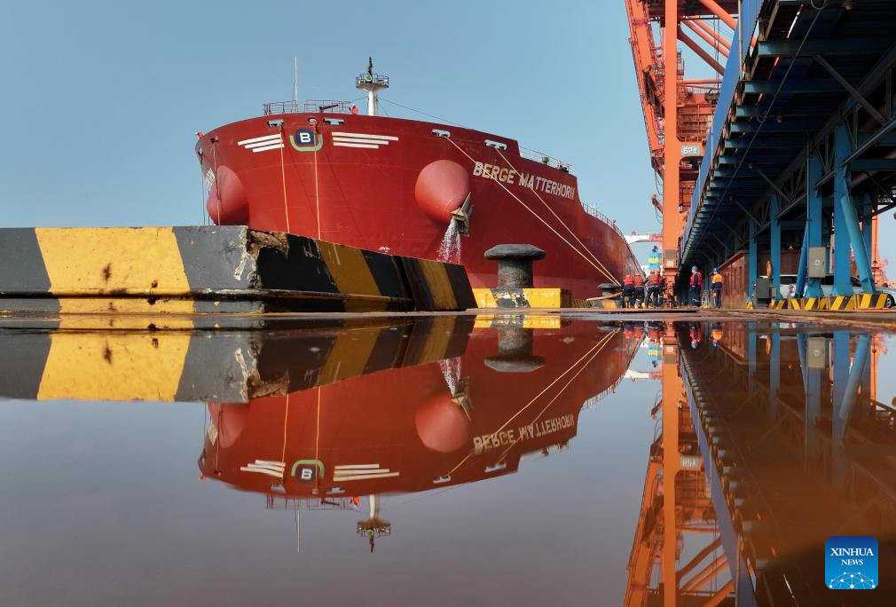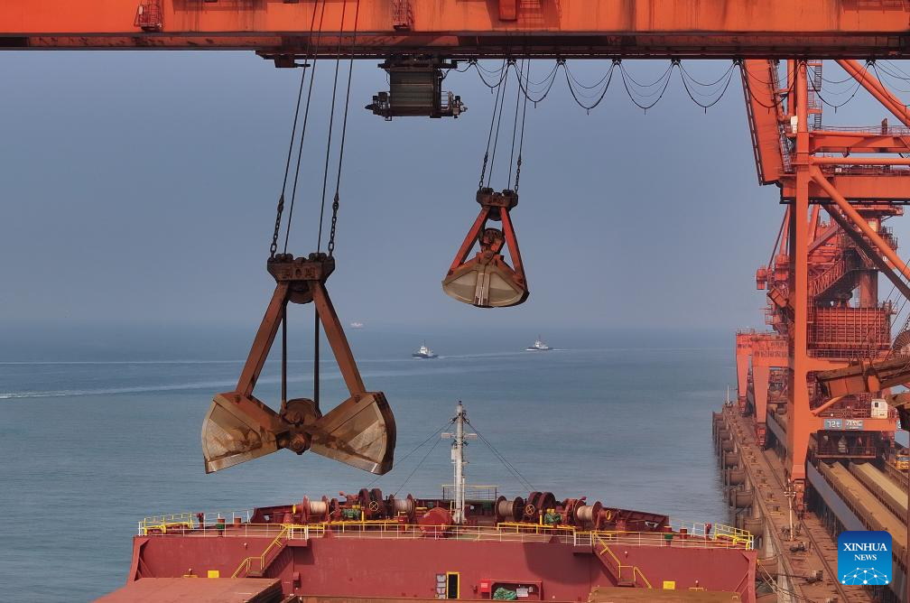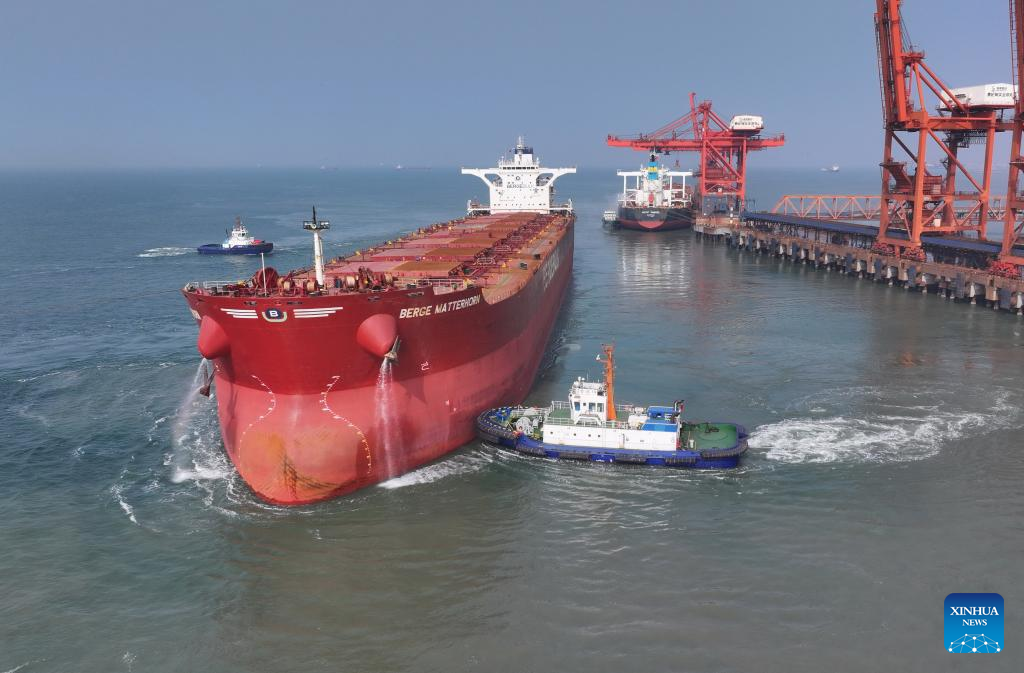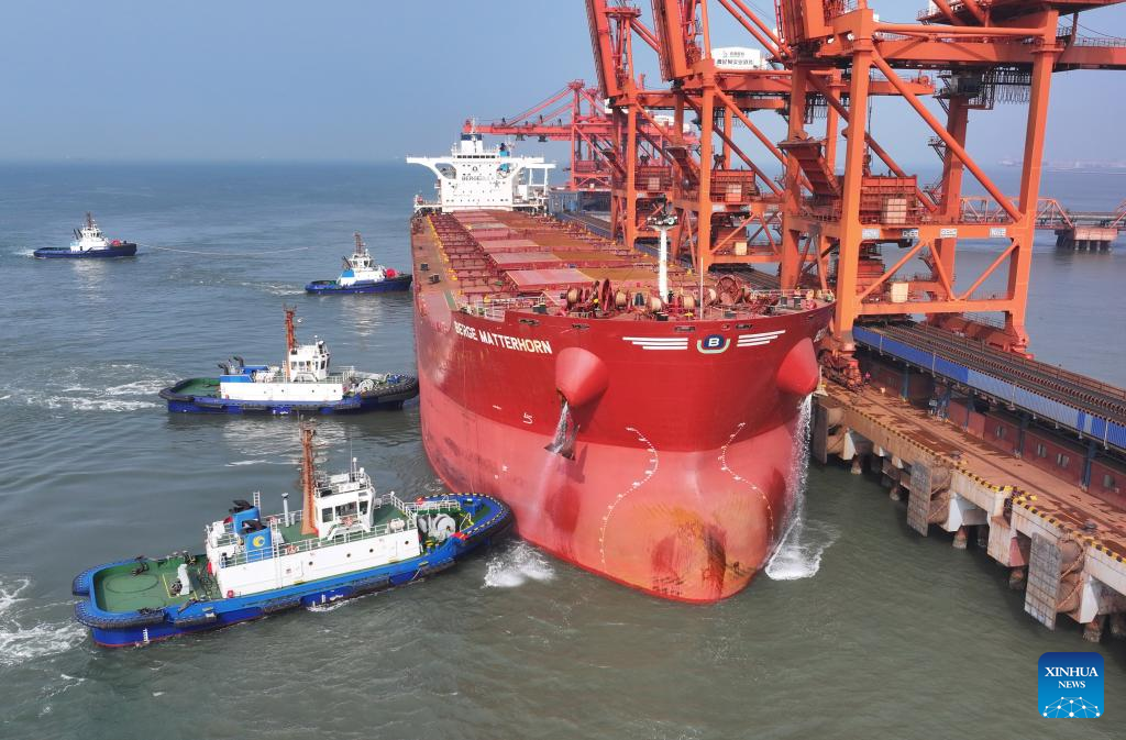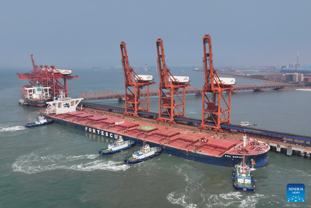 A drone photo taken on April 15, 2026 shows workers securing mooring lines to a vessel docking at the ore terminal of Caofeidian Port Area in Tangshan Port in Tangshan, north China's Hebei Province. From January to March this year, Caofeidian Port Area handled a cargo throughput of 138.03 million tonnes, marking a year-on-year increase of 3.16 percent. (Xinhua/Yang Shiyao)