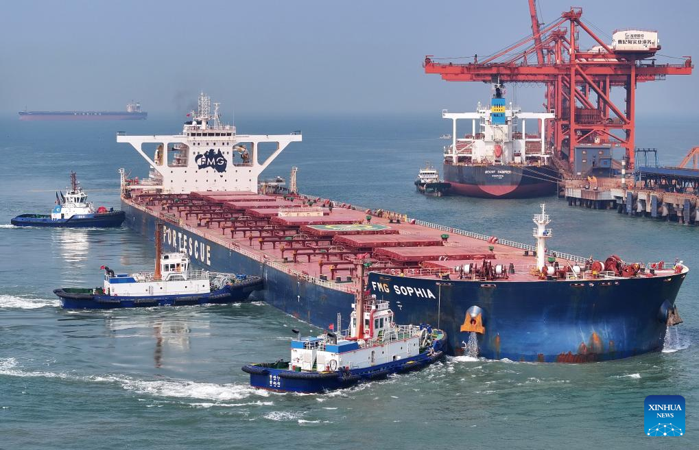 A drone photo taken on April 15, 2026 shows workers preparing a vessel for departure at the ore terminal of Caofeidian Port Area in Tangshan Port in Tangshan, north China's Hebei Province. From January to March this year, Caofeidian Port Area handled a cargo throughput of 138.03 million tonnes, marking a year-on-year increase of 3.16 percent. (Xinhua/Yang Shiyao)