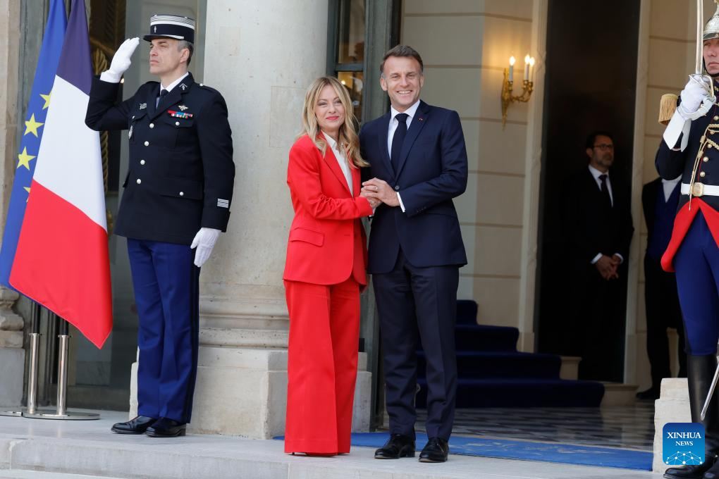 French President Emmanuel Macron (R) welcomes Italian Prime Minister Giorgia Meloni at Elysee Palace, in Paris, France, April 17, 2026. (Photo by Henri Szwarc/Xinhua)