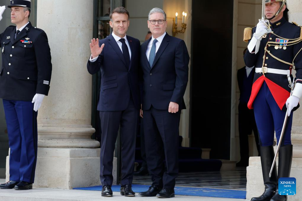 French President Emmanuel Macron (L) welcomes British Prime Minister Keir Starmer at Elysee Palace, in Paris, France, April 17, 2026. (Photo by Henri Szwarc/Xinhua)