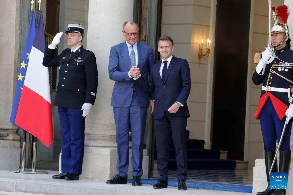 French President Emmanuel Macron (R) welcomes German Chancellor Friedrich Merz at Elysee Palace, in Paris, France, April 17, 2026. (Photo by Henri Szwarc/Xinhua)