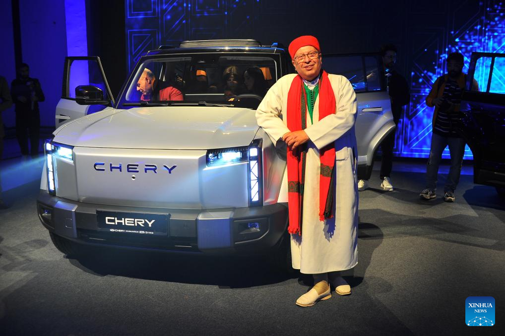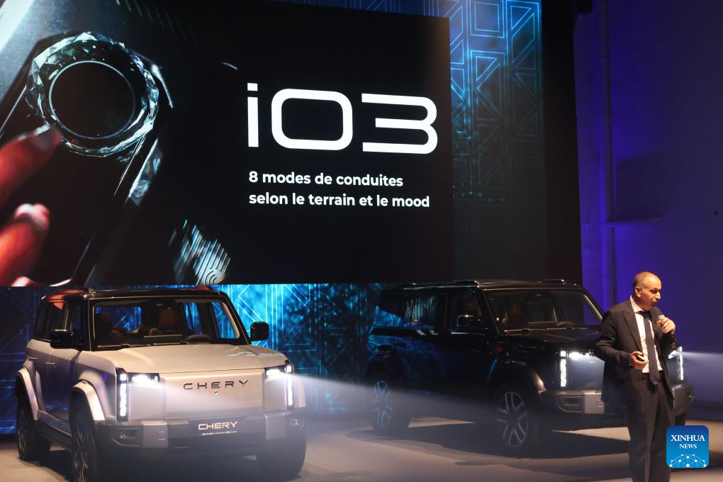 This photo taken on April 16, 2026 shows a scene of a launch event for Chery's new car in Tunis, Tunisia. Chinese automaker Chery unveiled i03, its first pure electric vehicle in Tunisia, during the car launch event held in Tunis on Thursday. (Xinhua/Zhou Haojin)