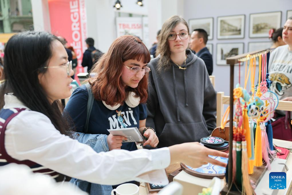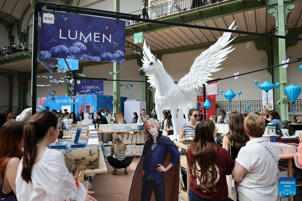 People visit a booth of Chinese publishers during the Paris Book Festival 2026 at the Grand Palais in Paris, France, April 17, 2026. The three-day event opened here on Friday. (Xinhua/Wu Huiwo)