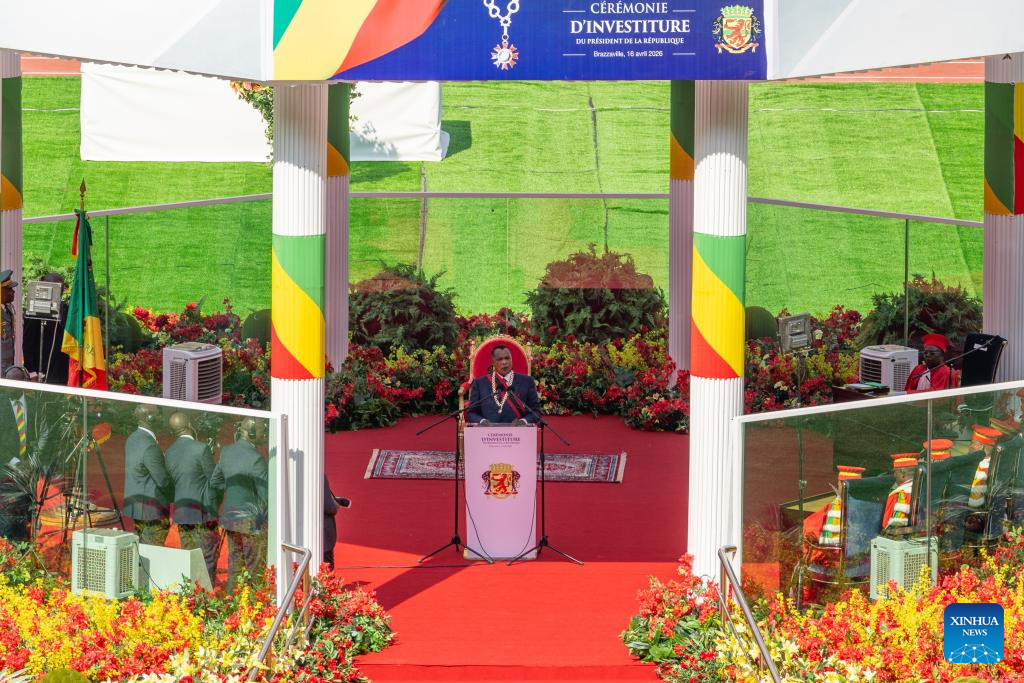 President of the Republic of the Congo Denis Sassou Nguesso delivers an inaugural address during his inauguration ceremony at Kintele Stadium in the northern suburbs of Brazzaville, the Republic of the Congo, April 16, 2026. President of the Republic of the Congo Denis Sassou Nguesso, re-elected in the March 15 presidential election, was sworn in on Thursday for a new five-year term. The ceremony took place at Kintele Stadium in the northern suburbs of Brazzaville, the capital city, in the presence of several African heads of state. (Xinhua/Zheng Yangzi)