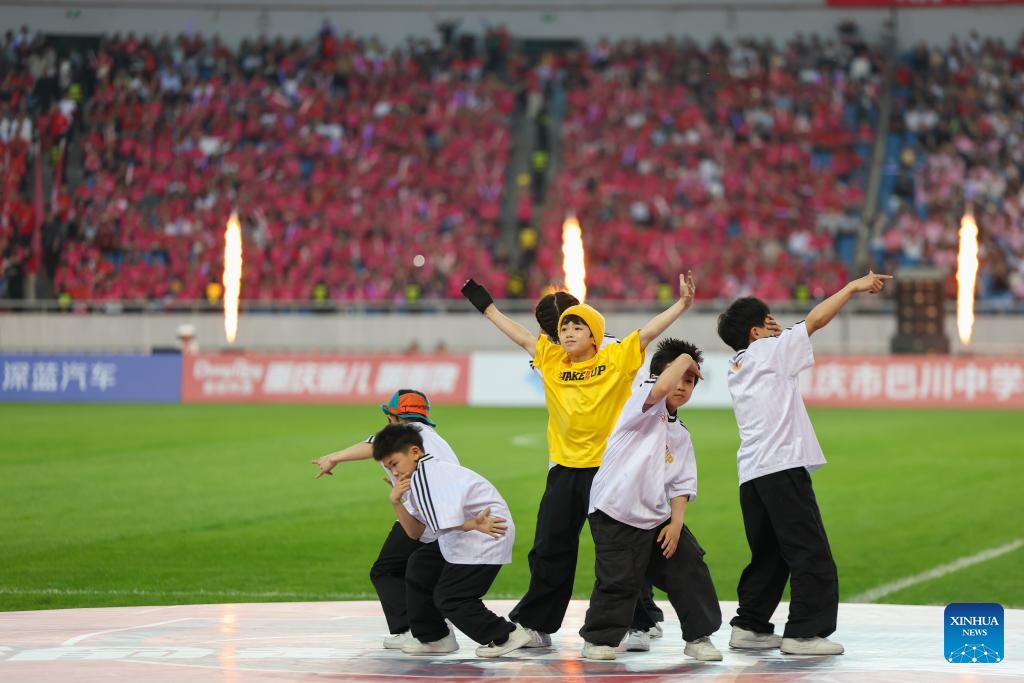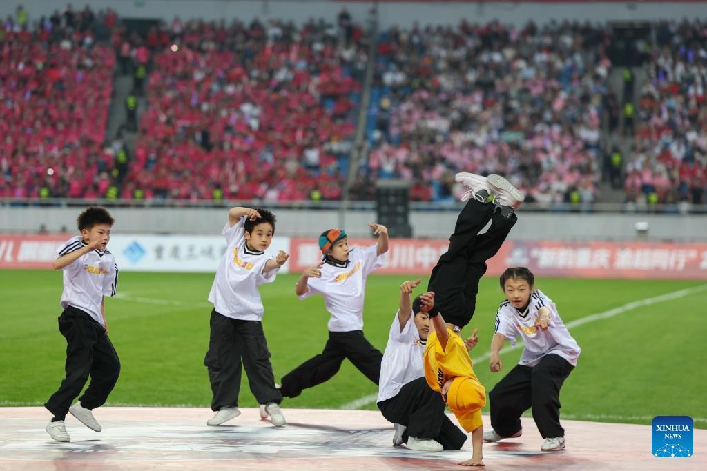 Li Yongqiu (front) preforms before the final match at the Chongqing Football City League in southwest China's Chongqing on April 12, 2026. Li Yongqiu, a 13-year-old Chinese boy, claimed gold in Junior Dance Tour at the Juste Debout 2026 World Finals in Paris, France on March 8, 2026, making history. It is a famous street dance event and brings together the best dancers from around the world. During the finals, Li performed a special routine. He combined breakdancing moves with Kung Fu. It made a deep impression on both the spectators and judges. Li started learning breaking when he was 8 years old. He joined the Chongqing breaking team in 2022. The team helps young dancers like him grow and compete at a high level. Li trains hard five to six days a week. Even with all that training, he still finds time to keep up with school. His hard work and strong spirit helped him become a champion. (Xinhua/Huang Wei)