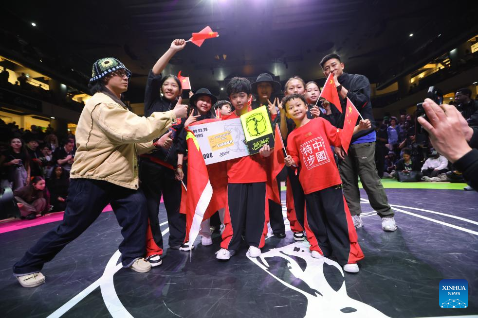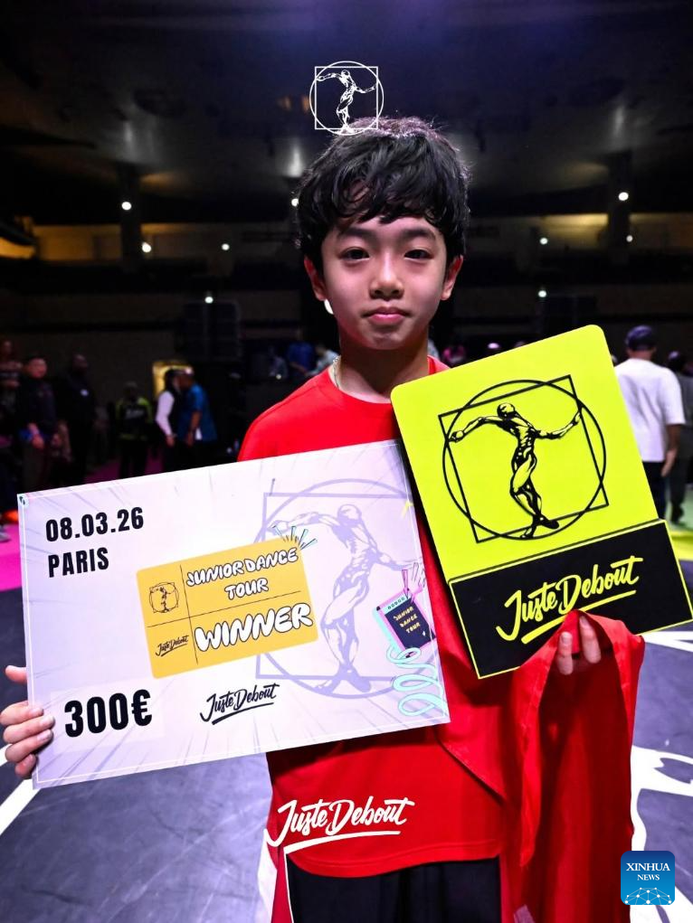 Li Yongqiu (C) celebrates after winning the Junior Dance Tour at the Juste Debout 2026 World Finals in Paris, France on March 8, 2026. Li Yongqiu, a 13-year-old Chinese boy, claimed gold in Junior Dance Tour at the Juste Debout 2026 World Finals in Paris, France on March 8, 2026, making history. It is a famous street dance event and brings together the best dancers from around the world. During the finals, Li performed a special routine. He combined breakdancing moves with Kung Fu. It made a deep impression on both the spectators and judges. Li started learning breaking when he was 8 years old. He joined the Chongqing breaking team in 2022. The team helps young dancers like him grow and compete at a high level. Li trains hard five to six days a week. Even with all that training, he still finds time to keep up with school. His hard work and strong spirit helped him become a champion. (Xinhua)
