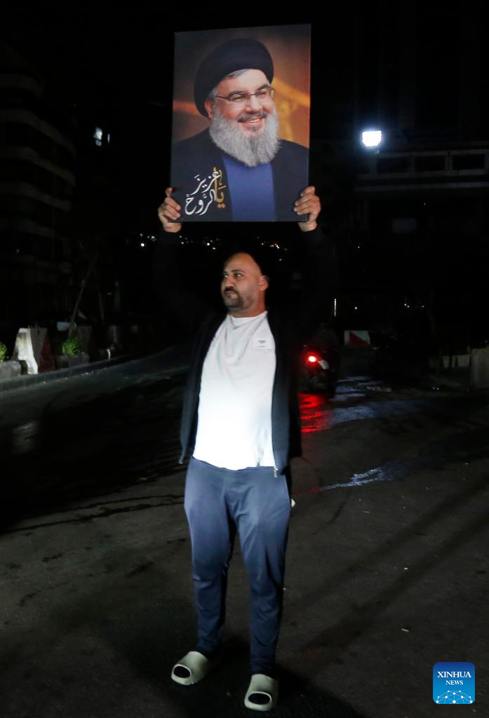 A displaced man bearing an image of the late Hezbollah leader Sayyed Hassan Nasrallah returns to the southern suburb of Beirut, Lebanon on April 16, 2025. A 10-day ceasefire between Israel and Lebanon took effect at midnight between Thursday and Friday local time (2100 GMT), following an earlier announcement by U.S. President Donald Trump. (Photo by Bilal Jawich/Xinhua)