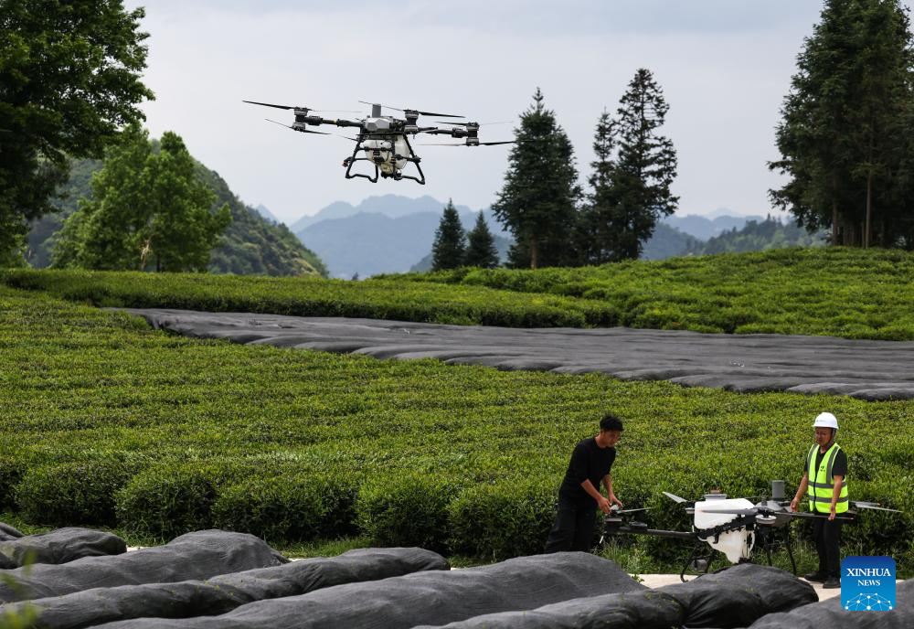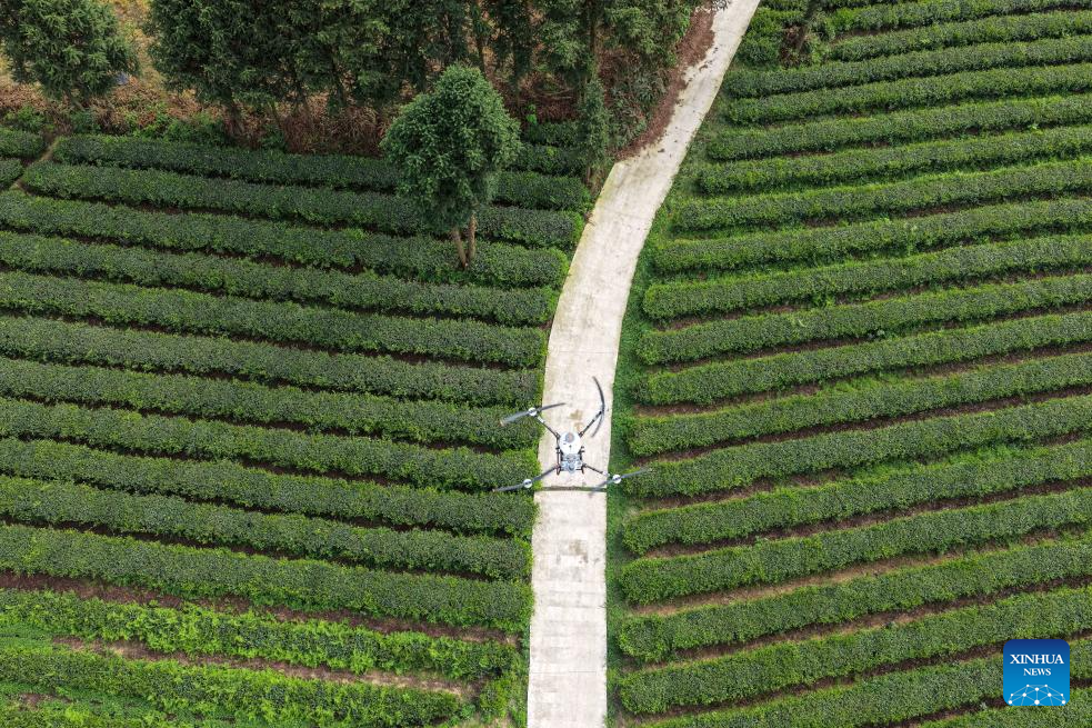 An aerial drone photo taken on April 17, 2026 shows a drone operated by an instructor for demonstration at a tea garden in Baicha Village of Yundong Town, Duyun City of Qiannan Bouyei and Miao Autonomous Prefecture, southwest China's Guizhou Province. Trainees on an agricultural drone application training course in Guizhou Province took part in practical exercises in Duyun City on Friday to improve their skills in operating crop protection drones. (Xinhua/Yang Wenbin)