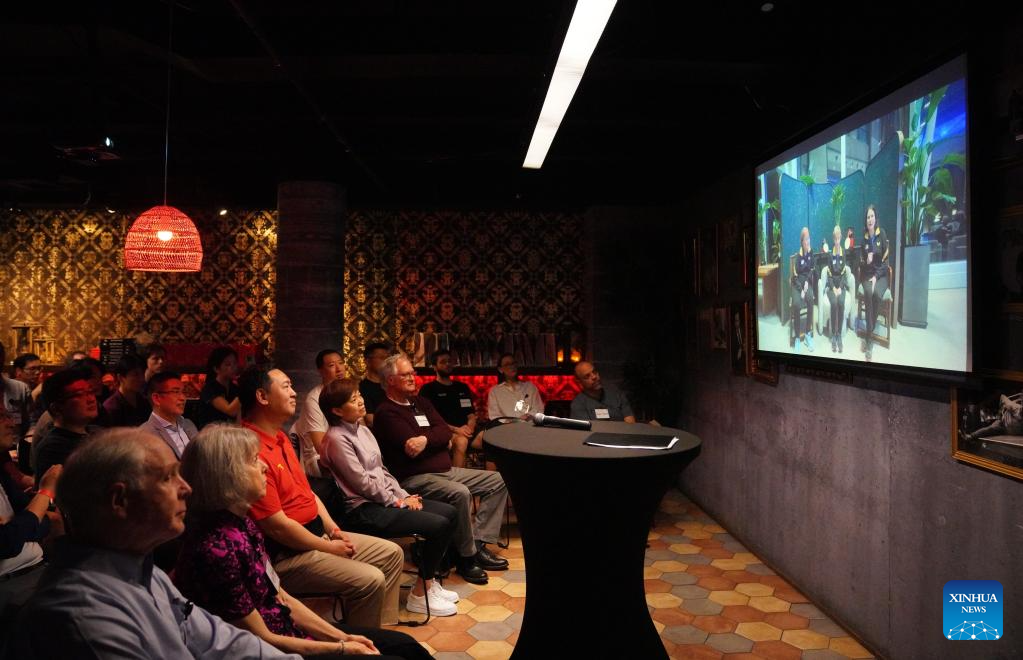 People watch a video message from former U.S. table tennis athletes during an event marking the 55th anniversary of "Ping-Pong diplomacy" in New York, the United States, on April 17, 2026. Chinese and U.S. table tennis athletes, university representatives and local enthusiasts gathered here on Friday to mark the 55th anniversary of "Ping-Pong Diplomacy," celebrating the enduring friendship fostered through sports exchanges.(Xinhua/Zhang Fengguo)