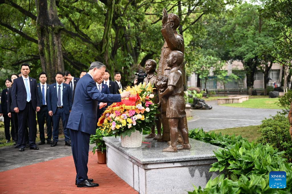 To Lam, general secretary of the Communist Party of Vietnam Central Committee and president of Vietnam, pays tribute to the statue of late Vietnamese leader Ho Chi Minh at the former site of Nanning Yucai School, in Guangxi University in Nanning, south China's Guangxi Zhuang Autonomous Region, April 17, 2026.