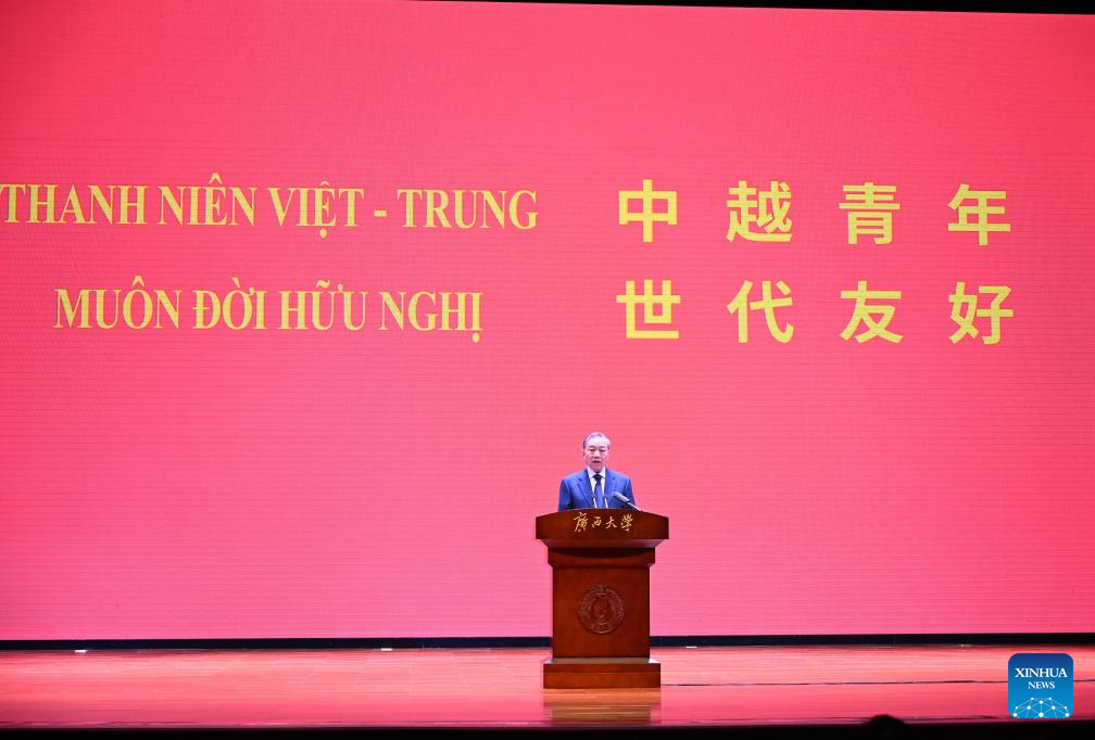 To Lam, general secretary of the Communist Party of Vietnam Central Committee and president of Vietnam, speaks at the former site of Nanning Yucai School, in Guangxi University in Nanning, south China's Guangxi Zhuang Autonomous Region, April 17, 2026.