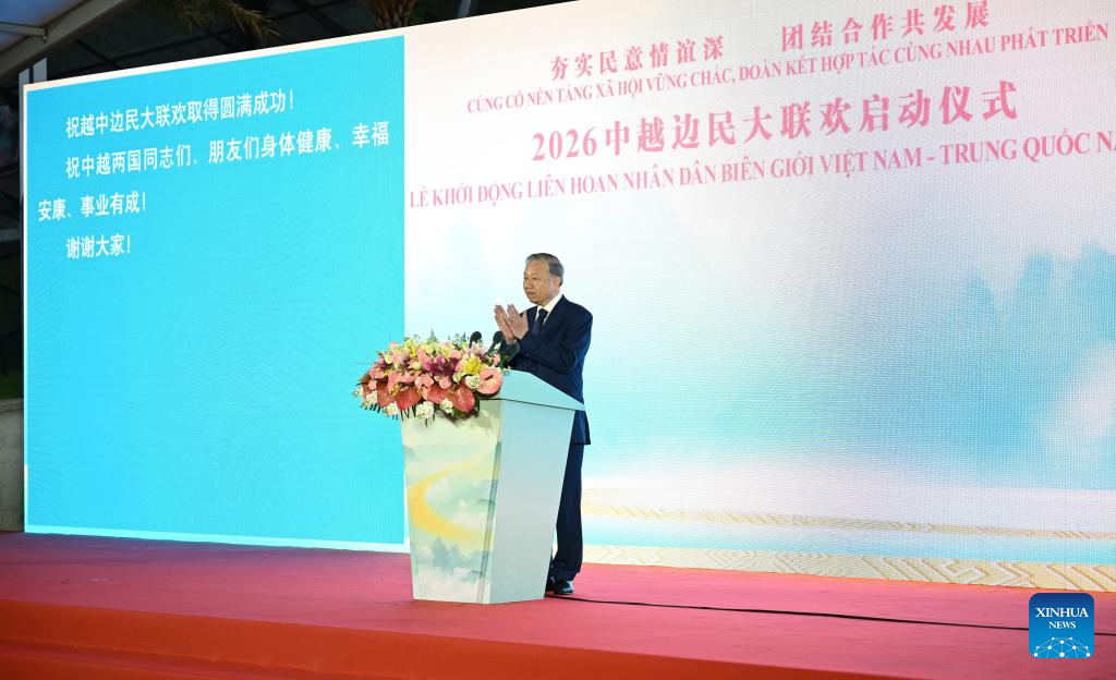 To Lam, general secretary of the Communist Party of Vietnam Central Committee and president of Vietnam, attends the launch ceremony of the 2026 China-Vietnam border residents' exchange event in Nanning, south China's Guangxi Zhuang Autonomous Region, April 17, 2026.